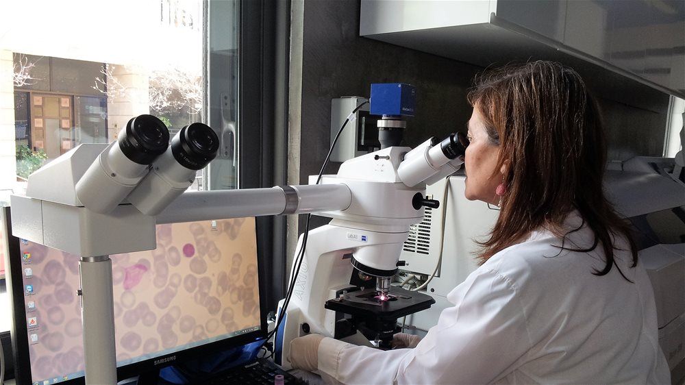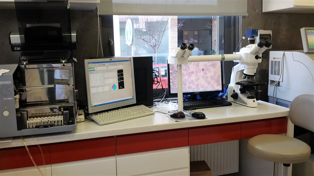 Το Εργαστήριο είναι εξοπλισμένο με υπερσύγχρονο μικροσκόπιο ZEISS με συμπαρατήρηση και φωτογραφική κάμερα συνδεδεμένο με υπολογιστή. Διαθέτει τέσσερις προσοφθάλμιους φακούς ώστε παράλληλα να γίνεται εκπαίδευση ειδικευόμενων ιατρών και άλλων επαγγελμάτων Υγείας (βιολόγων, τεχνολόγων κ.α.) Η ιατρός βλέπει πλακάκι σε όλες τις γενικές αίματος και παρέχεται η δυνατότητα φωτογράφησης κάθε παθολογικού ή άλλου αξιοσημείωτου ευρήματος. Η φωτογραφία που εκτυπώνεται συνοδεύει την απάντηση του εξεταζόμενου και αποτελεί πολύτιμο στοιχείο και πληροφορία για τον ασθενή και τον επιβλέποντα ιατρό του. Αυτό έχει ιδιαίτερη σημασία γιατί ο θεράπων ιατρός ενημερώνεται και οπτικά για τους ασθενείς του(καρκινοπαθείς υπο θεραπεία, σοβαρές ασθένειες όπως λευχαιμίες, βαριές αναιμίες, λοιμώξεις όπως η λοιμώδης μονοπυρήνωση, κολπίτιδες και άλλες παθήσεις).